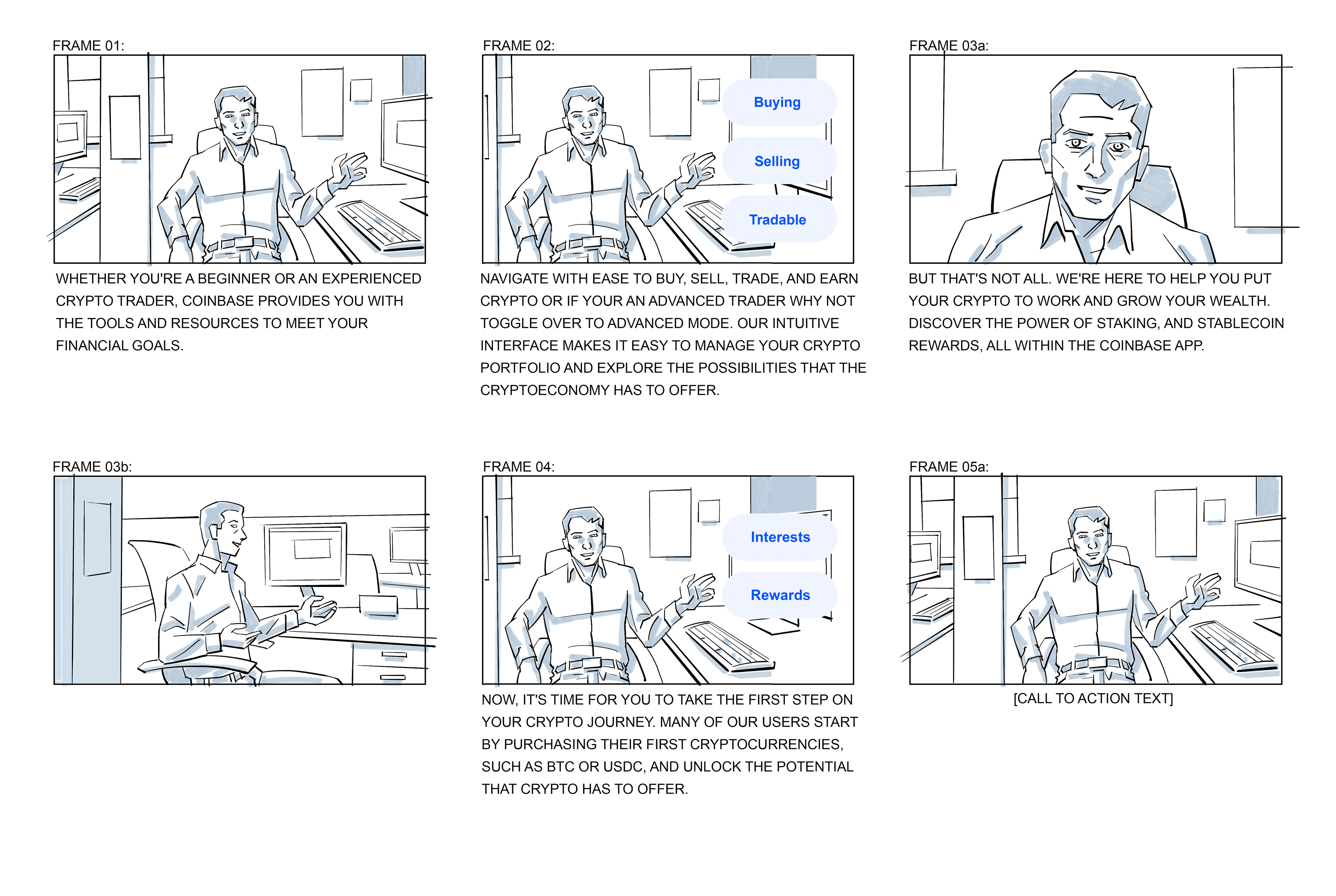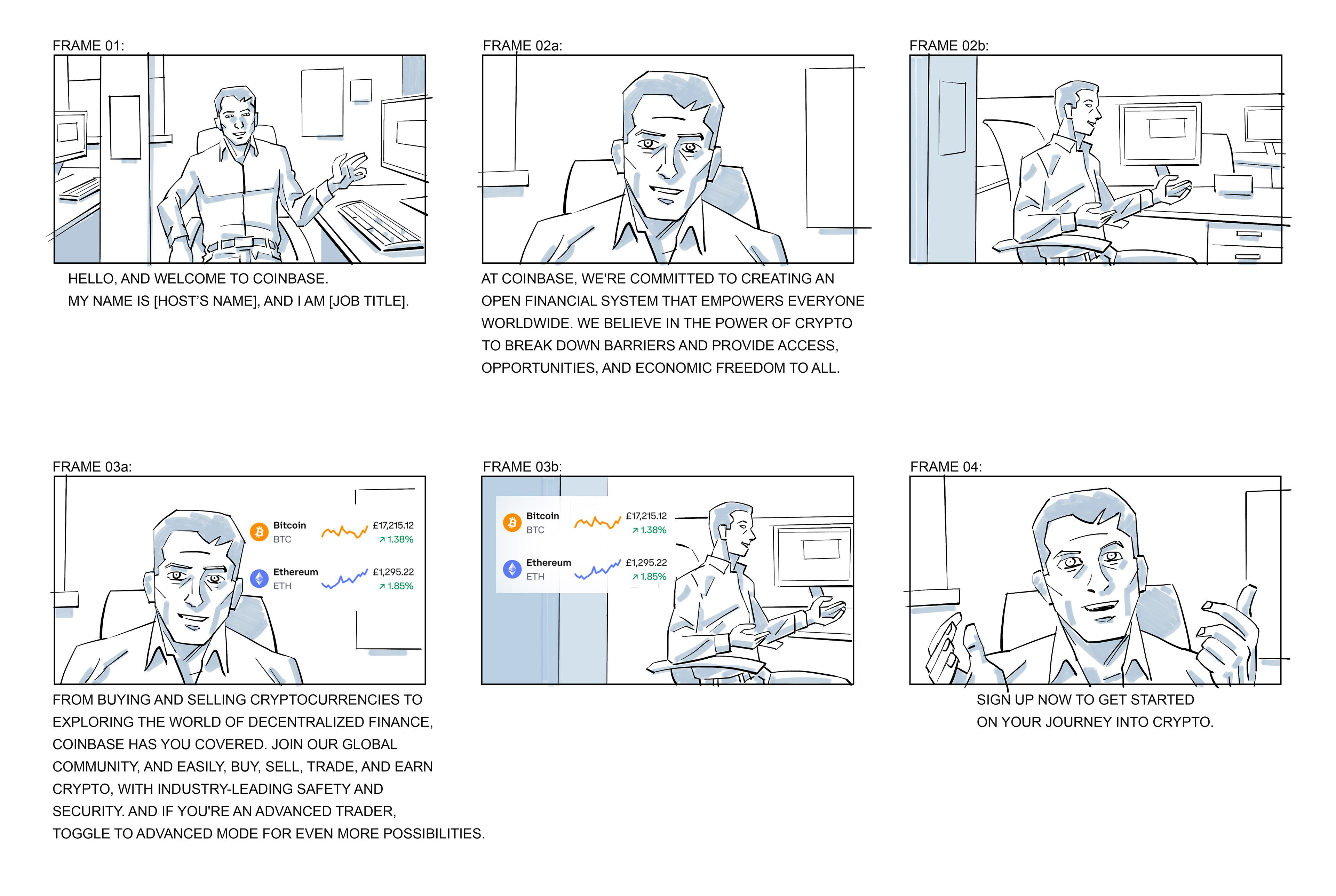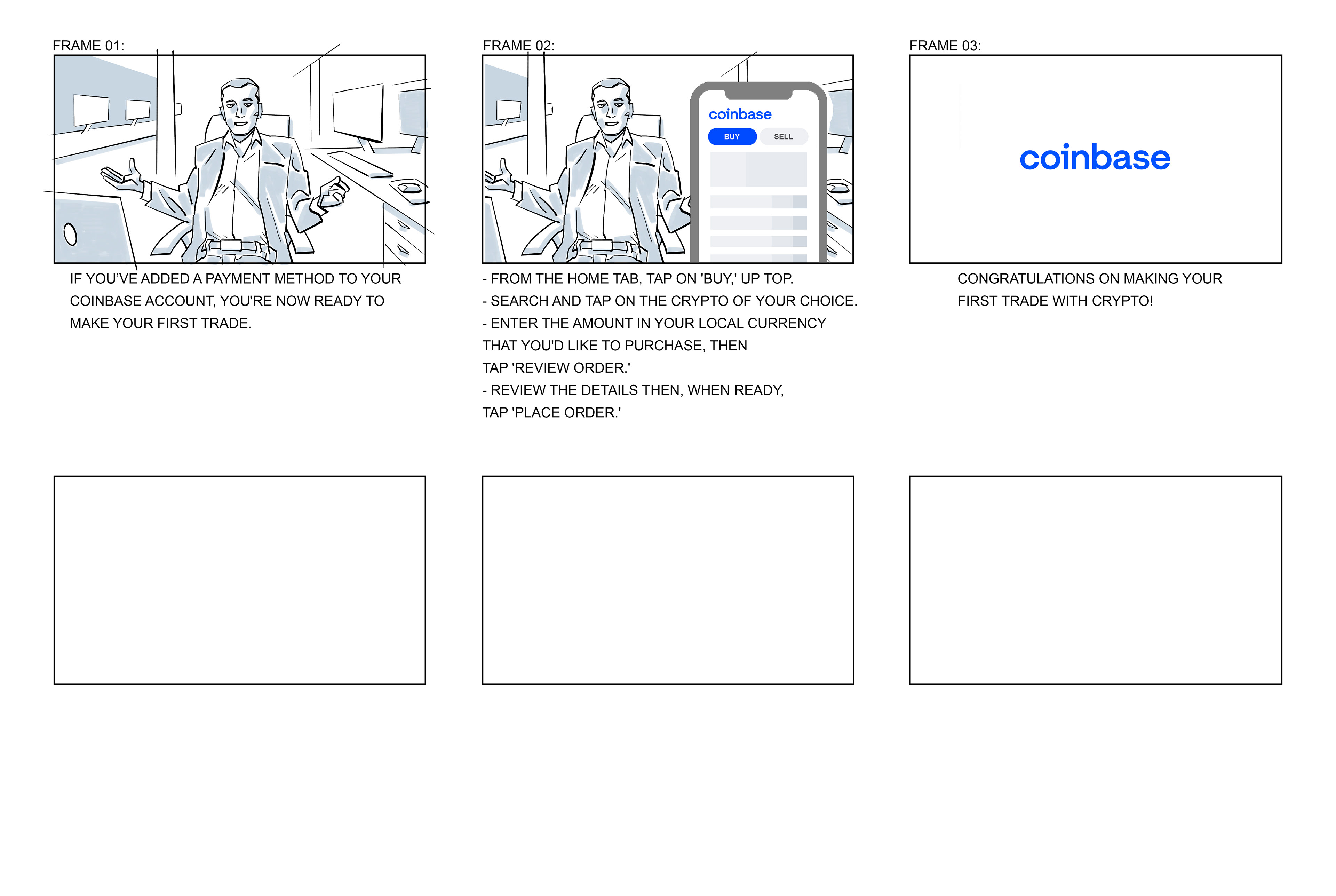 Excerpts of storyboards from a series of user guide videos for the COINBASE platform, with The Film Farmers.